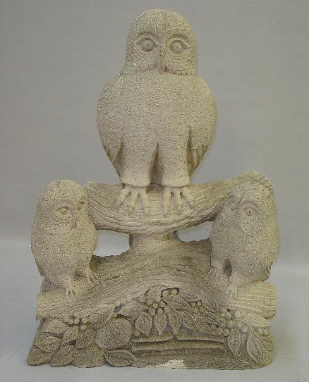 STONE SCULPTURE. Limestone with three owls perched