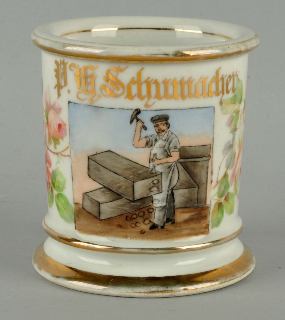 SoldA Stone Mason's Porcelain Occupational Shaving MugA Stone Mason's Porcelain Occupational Shaving Mug with the name C. Getzendanner in gilt lettering, depicting a man chiseling limestone. underside marked with an illegible blue mark, and is stamped TKSee Sold Price