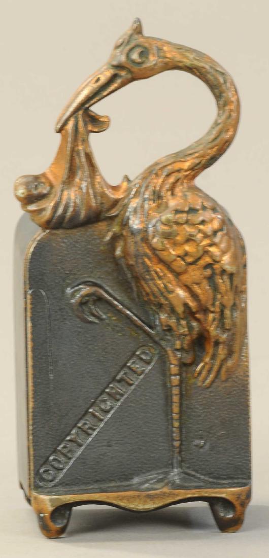 SoldSTORK SAFE STILL BANKJ.M. Harper, Chicago, IL, circa 1907, scarce example, depicts stork holding baby in blanket by beak, front panel has safe handle and embossed pattern with copr. lettering. Provenance: Bob Brady CollecSee Sold Price
