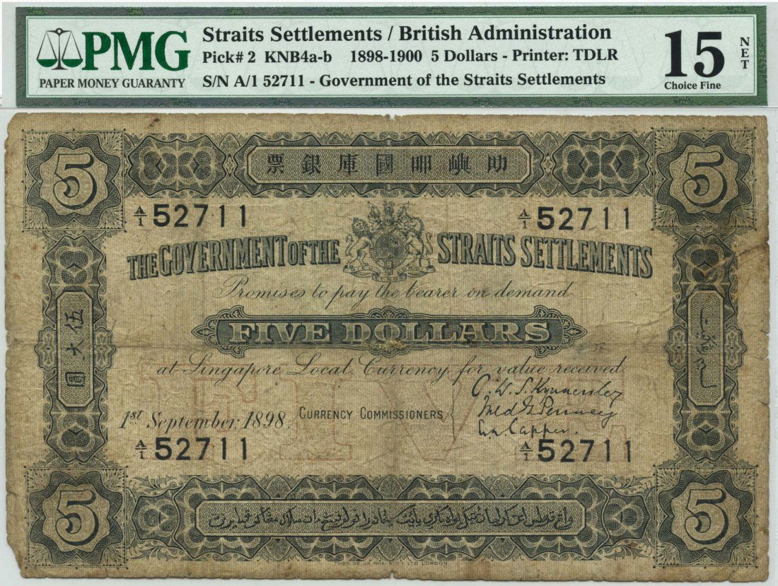 STRAITS SETTLEMENTS $5 1898 PMG 15 NET