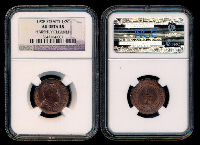 SoldStraits Settlements KEVII 1/2c 1908 NGC AUStraits Settlements Edward VII, Half Cent, (KM.18), 1908, NGC AU Details - harshly cleaned.See Sold Price