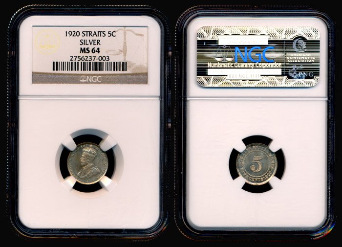 Straits Settlements KGV 5c 1920 silver MS64