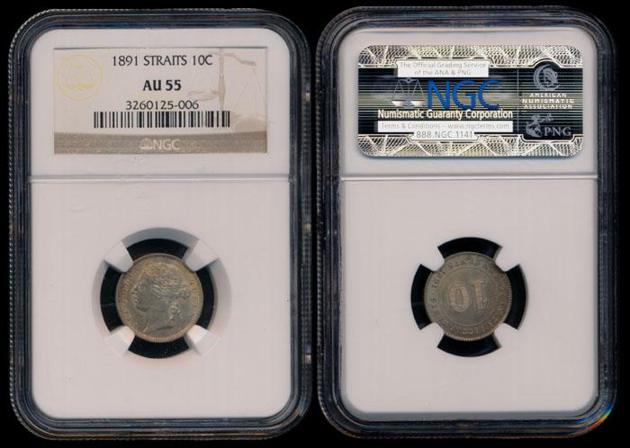 Straits Settlements QV 10c 1891 NGC AU55
