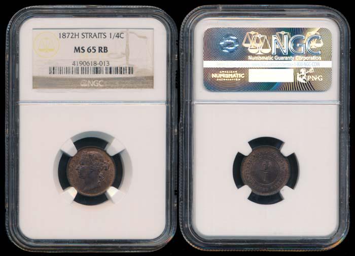 Straits Settlements QV 1/4c 1872H NGC MS65RB