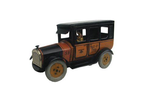 SoldSTRAUSS TIN WINDUP YELL-O-TAXIStrauss tin windup Yell-O-Taxi. All original and complete. Nice Taxi graphics. Windup works. 8 1/2" ExcellentSee Sold Price