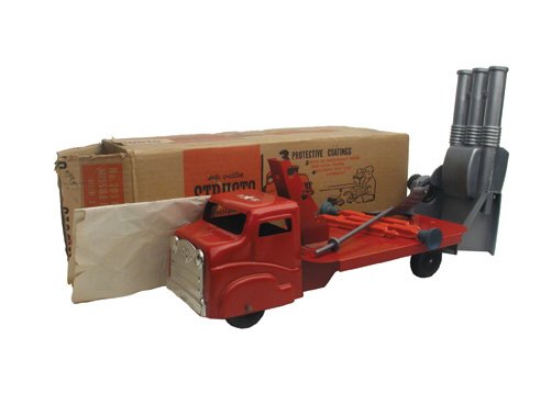 SoldBuddy L GMC Intercontinental Missile Launcher TruckThis is a Buddy L GMC Intercontinental Missile Launcher truck. It comes with its plastic rocket, is in great condition, and measures approximately 19.5" L.See Sold Price