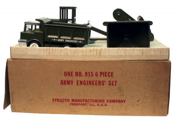 SoldStructo Army Engineers Dump Truck w/ Sand LoaderOriginal Structo Army Engineers dump truck with sand loader and sand hopper. Good condition with some light wear from age. The truck measures approximately 12" long.See Sold Price