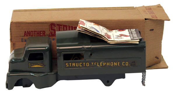 SoldStructo No. 920 Telephone Co. Truck w/ BoxStructo cabover Structo Telephone Co. truck with the original box. The truck comes with the parts sheet, screw driver, wrenches, and hammer. The truck has some scuffs and wear to the decals from beingSee Sold Price