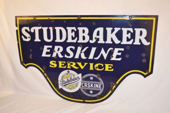 SoldPorcelain 48" Studebaker Erskine Service signDouble sided Porcelain with dings and corrosion to interior and perimeter See Photos 48" w x 32" TSee Sold Price