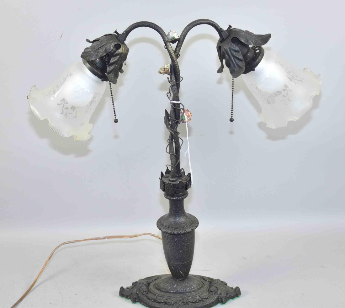 SoldAttributed to Tiffany Double-Student LampAttributed to Tiffany Double-Student Lamp , early 20th c., converted oil lamp, damascene shades, unmarked, h. 19, w. 22 in., d. 7 1/2 inSee Sold Price