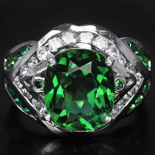 Stunning Chrome Diopside RingRING SIZE, LENGTH OF ITEM (Inch.)6.50 ;ITEM QUANTITY1;STONE SHAPE-OVAL PORTUGUESE CUT; STONE DIMENSION11 X 9 MM.CLARITYIF;LUSTERENCHANTING;OTHERFACE OF RING 20 X 15 MM. ;WHITE & GREEN CUBIC ZIRCONIA 2See Sold Price