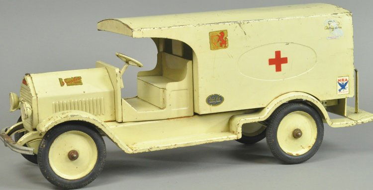 SoldSTEELCRAFT ART DECO STREAMLINE AMBULANCEScarce Steelcraft Art Deco pressed steel Ambulance. All original with very nice paint. Very hard truck to find, especially in this condition. 21" ExcellentSee Sold Price