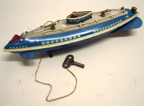 SoldJAPAN TIN BOAT & WOLVERINE TIN SUBMARINELot includes a very detailed Japan crank windup Commander boat that works, alog with a windup Wolverine Sugmarine that also works. No key is inlcuded for submarine. Largest is 13" ExcelelntSee Sold Price