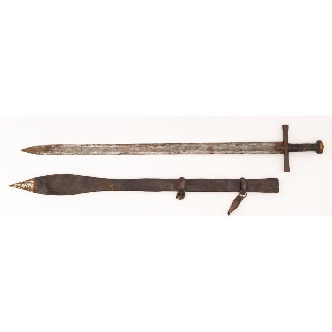 SoldSudanese Kaskara Sword19th century A.D. Of knightly form; composed of a straight double-edged blade of 35.5 inches in length and with central fuller, cruciform hilt, steel cross-guard and bound wooden handle; accompanied bSee Sold Price