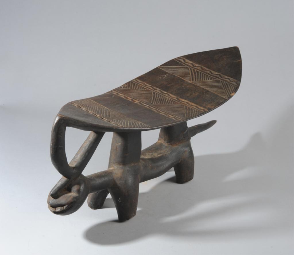 Caryatid stool "kipona" ("kihona") with mother figure - D. R. Congo, Luba-Shankadi, Sungu, Kiloko ofwood, pigments, age related cracks Probably a work of the master carver Kiloko of Bussangu. Posture, physignomy, forehead scarification and the design of the hairstyle speak for it. In this regard, co