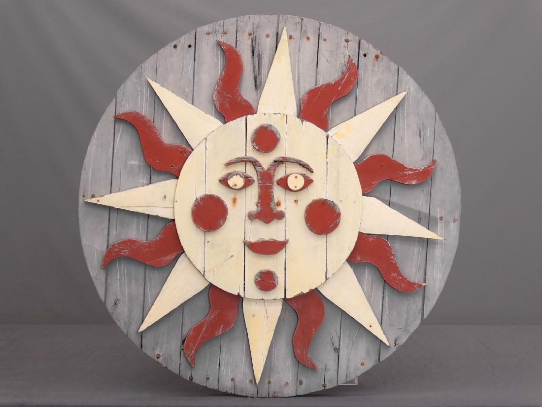 SoldGarden Sun PlaqueGarden sun plaque with face. Sheet metal. Mid to late 20th century.D 30 in.Condition: Surface wear from outdoor use.See Sold Price