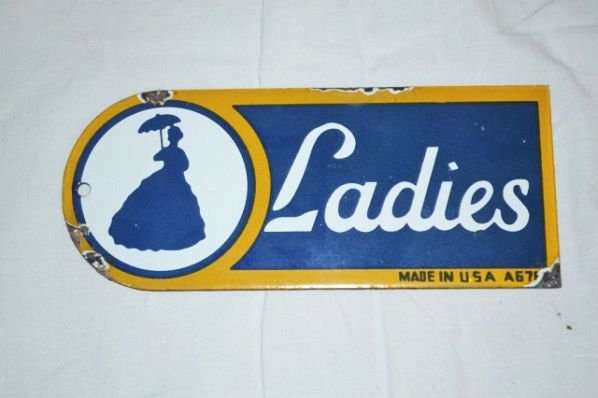Sold2 Vintage Ladies Restroom SignsLadies porcelain double sided sign, some wear and scratches, 6 x 15.5 Ladies Restroom flange 5 x 15 x 1 slign bend to flangeSee Sold Price