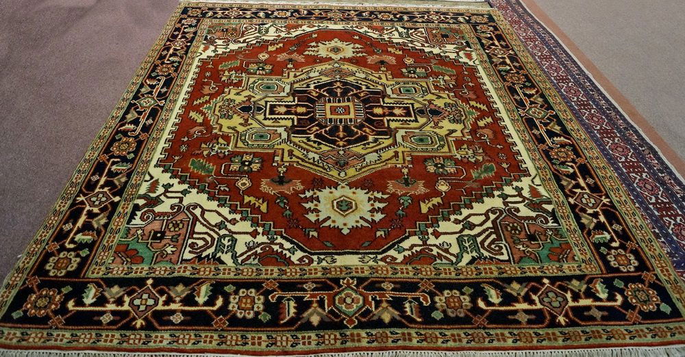 SoldIndo- Persian Heriz, 9X12 Mint New Hand Knotted SuperRug ID:1109 Origin: Indian Type: Area rug Woven:Hand Knotted Size:9x12’ Highlight Colors: Red, Green ,beige Design: serapi Heriz Knot Density:88-100kpsi Pile Material:100% Wool FoundatiSee Sold Price