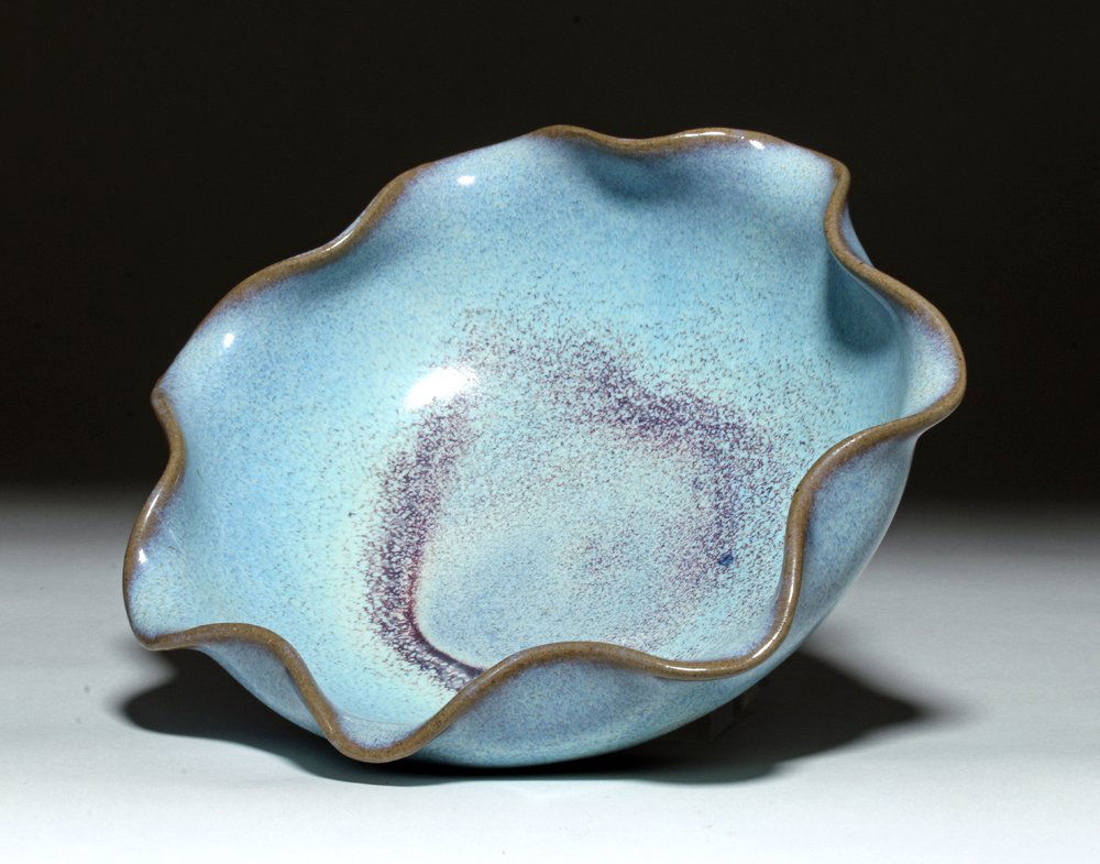 SoldSuperb Chinese Jin/Yuan Dynasty Purple-Splash Bowl - TLEast Asia, China, Jin to Yuan Dynasty, ca. 12th to 13th century CE. A stunning Jun-Ware / Junyao ceramic bowl with a scalloped rim, the surfaces decorated with luscious sky blue glaze with added purplSee Sold Price