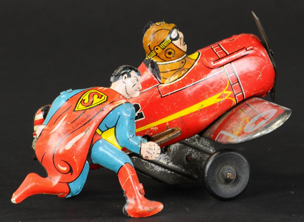 SoldMARX TIN WINDUP SUPERMAN ROLLOVER PLANE w/ BOXMarx tin windup Superman Rollover Plane. Colorful red plane version. All original and complete. Toy has great colors. Windup works. A great early Superman toy. Seldom found in this condition. Comes wiSee Sold Price