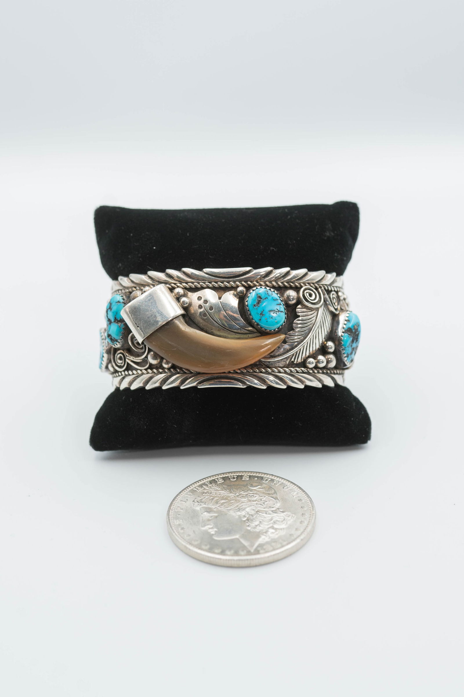 SoldTHOMAS BEAR CLAW CUFF STERLING SILVER 109GRAMFABULOUS VINTAGE ESTATE ARTIST SIGNED "M THOMAS JR & STERLING". BRACELET ACCENTED WITH A GENUINE BEAR CLAW, MEDITERRANEAN RED CORAL AND GEM TURQUOISE. NATIVE AMERICAN SOUTHWEST INDIAN NAVAJO JEWELRY.See Sold Price