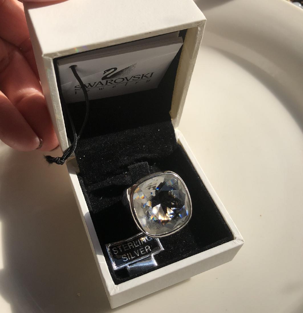 SoldSwarovski Crystal Cocktail Ring Sz. 6Swarovski Faceted Crystal Ring, Oblong, with clear trilliant cut crystals on each corner, Swan signed. Size 6, Original Box included. Excellent pre-owned condition.See Sold Price