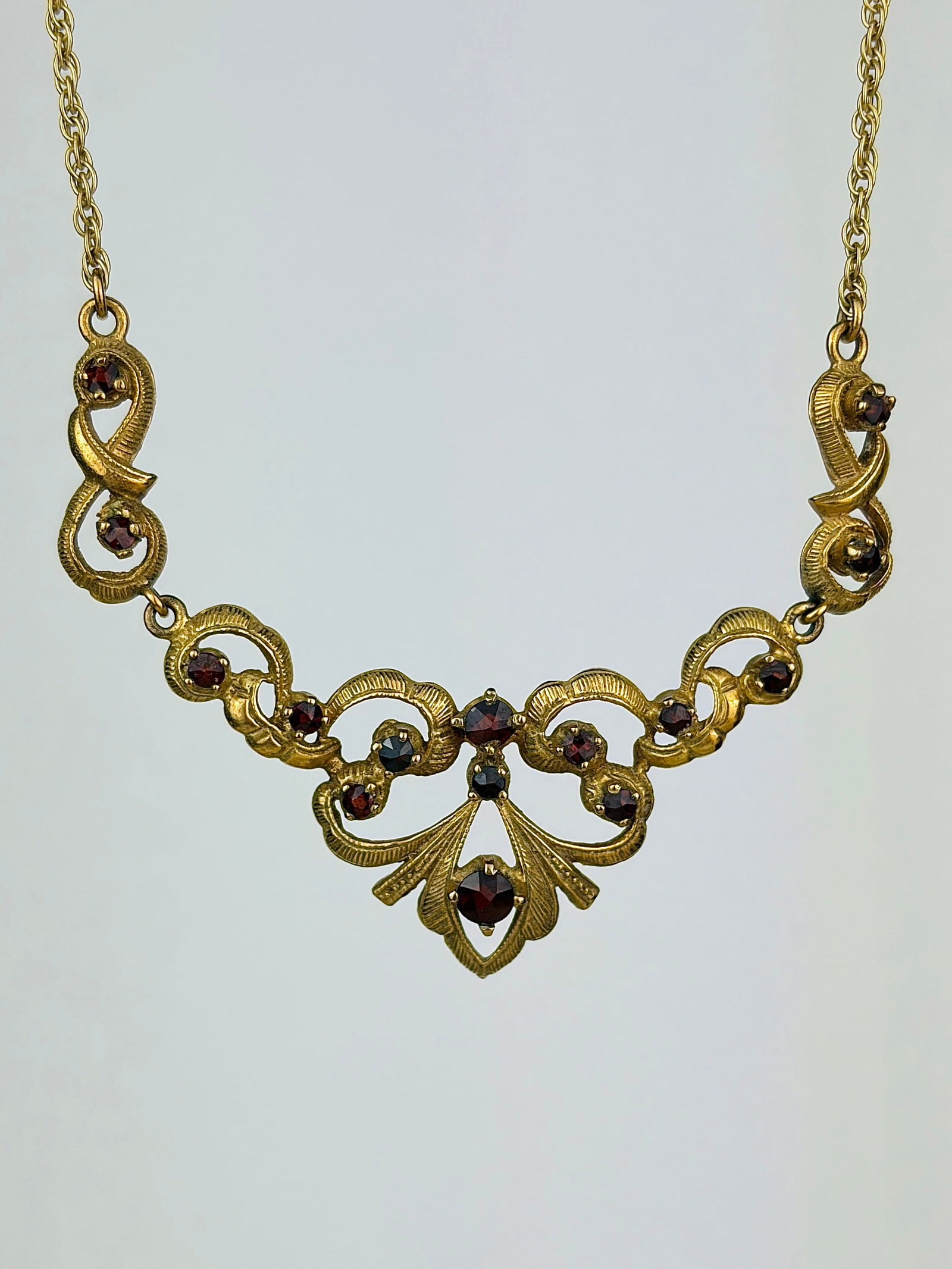21KT GOLD GARNET DOUBLE CHAIN FLORAL MOTIF DANGLE VINTAGE NECKLACE 17K PENDANTSModern Jewelry4.4(204)See Sold PriceJul 13, 2025