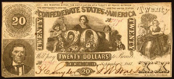 1861 Confederate States of America $20 Note. Richmond, September 2, 1861Feb 26, 2026Sept. 2, 1861 Confederate States Of America $20 NoteFeb 27, 2026Sept. 2, 1861 Confederate States Of America $20 NoteFeb 27, 2026Sept. 2, 1861 Confederate States Of America $20 NoteFeb 27, 2026Sept. 2, 1861 Confederate States Of America $10 NoteFeb 27, 20261861 $20 Confederate NoteFeb 26, 2026July 25th, 1861 Confederate States Of America $20 NoteFeb 27, 2026July 25th, 1861 Confederate States Of America $20 NoteFeb 27, 20261861 $20 Confederate States T-18 PMG VF25 Certified Note5 days LeftConfederate States of America, Two Dollars T70.Mar 11, 2026July 25th, 1861 Confederate States Of America $10 NoteFeb 27, 2026July 25th, 1861 Confederate States Of America $10 NoteFeb 27, 20261861 $10 Confederate States T-22 PMG VG10 Certified Note6 days LeftConfederate States of America. Group of Two [2] Twenty Dollars Banknotes.Mar 11, 2026July 25th, 1861 Confederate States Of America $10 NoteFeb 27, 2026Feb. 17th, 1864 Confederate States Of America $500 NoteFeb 27, 2026