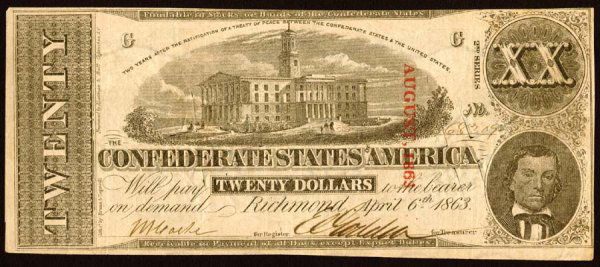 1861 Confederate States of America $20 Note. Richmond, September 2, 1861Feb 26, 20261863 State of Florida $3 Treasury Note TallahasseeFeb 26, 2026April 6th, 1863 Confederate States Of America $10 NoteFeb 27, 2026Feb. 17th, 1864 Confederate States Of America $500 NoteFeb 27, 2026Uncertified 1864 $500 Confederate States of America Note T-64 EFMar 03, 2026February 17th, 1864 Confederate States Of America $5 NoteFeb 27, 2026Sept. 2, 1861 Confederate States Of America $10 NoteFeb 27, 2026Sept. 2, 1861 Confederate States Of America $20 NoteFeb 27, 2026December 2nd, 1862 Confederate States Of America $10 NoteFeb 27, 20261862-63 $100 Confederate Note PMG AU55 Certified5 days Left(746) 1861 $10 CONFEDERATE STATES OF AMERICA NOTE T-28 PF-8 CR-235A PCGS 25 VF6 days LeftVF25 1861 $20 Confederate States of America T-18 CSA PMGFeb 23, 2026Sept. 2, 1861 Confederate States Of America $20 NoteFeb 27, 2026February 17th, 1864 Confederate States Of America $10 NoteFeb 27, 2026Feb. 17th, 1864 Confederate States Of America $100 NoteFeb 27, 2026December 2nd, 1862 Confederate States Of America $10 NoteFeb 27, 2026