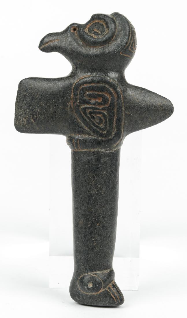 SoldTaino Figural Bird Ax (1000-1500 CE)Taino Figural Bird Ax (1000-1500 CE). Small volutes at center may represent feet. Large eyes suggest bird, possibly an owl. Simple but imposing. Size: 9'' x 4.5'' x 1.5'' (23 x 11 x 4 cm). Provenance:See Sold Price