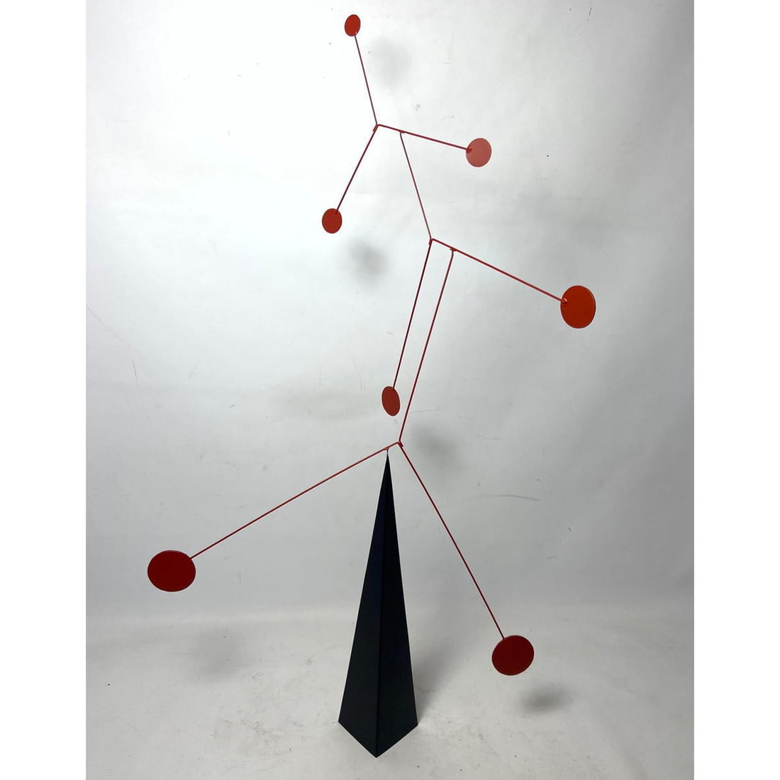 Modernist Kinetic Stabile Sculpture . Tall black triangle supports red metal mobile with red discs.