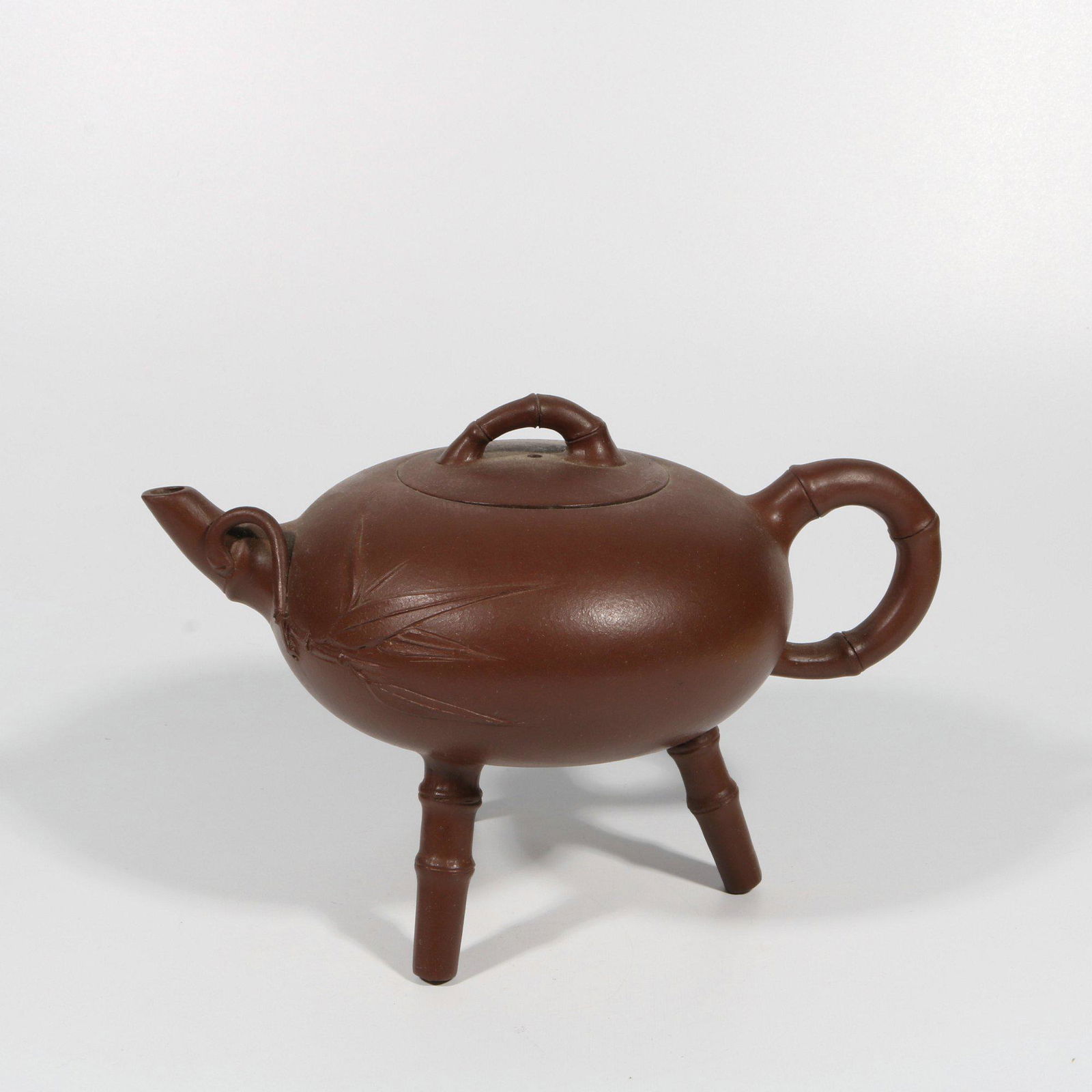 SoldA PURPLE CLAY TEAPOT, WITH BAMBOO DESIGN.Purple Clay Teapot, with Bamboo Design, Bamboo-Joint-Shaped Handle and Spout.See Sold Price