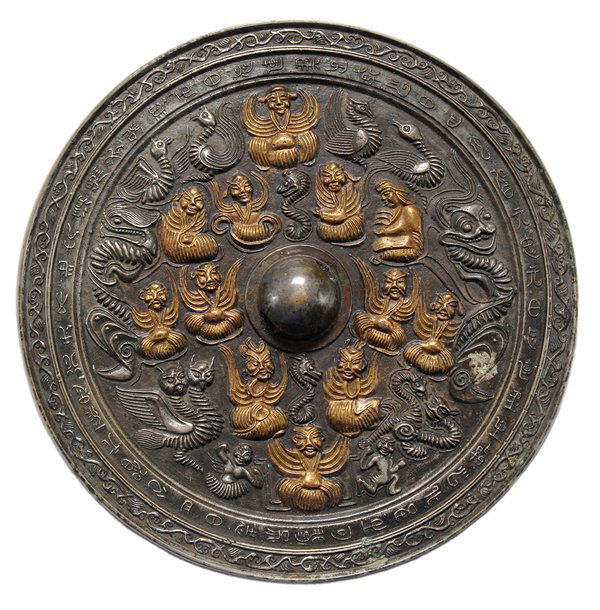 SoldANOTHER GOOD QUALITY LARGE CHINESE TANG-STYLE SILVEREDANOTHER GOOD QUALITY LARGE CHINESE TANG-STYLE SILVERED AND GILDED BRONZE MIRROR, decorated to its centre with archaic motifs and with a kirin and a tiger, the surfaces with some patination, 8.7in diamSee Sold Price