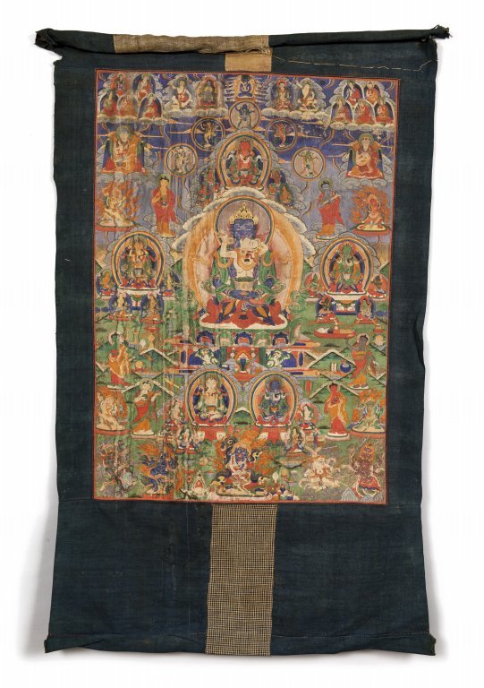 Tanka con 42 Buddha, tempera su cotone Cina