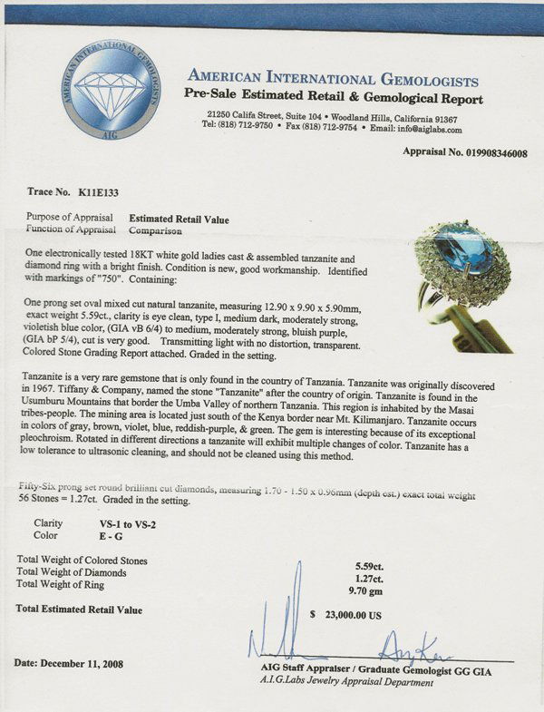 Tanzanite Ring 2.10CT Diamond:1.15 CT 14k W/G