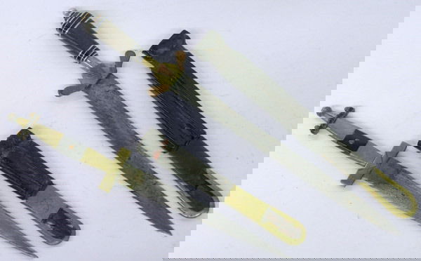 Lot Of Three BayonetsCollection of Indo-Persian Daggers and Custom Hunting Knives Group Lot6 days LeftLOT OF 4: SOUVENIR DAGGERS.Mar 03, 2026Imperial Fixed Blade Knife Lot w/ Moose Handles and Leather SheathMar 02, 2026LOT OF 3: THIRD REICH MINIATURE SS DAGGERS.Feb 25, 2026LOT OF VINTAGE STAG HANDLE FIXED BLADE KNIVESFeb 21, 2026LOT OF 2: GOLD RUSH ERA DAGGERS WITH ONE ETCHED GOLD SEEKERS PROTECTION.Feb 25, 2026LOT OF 2: EARLY GERMAN MADE WILD BOAR FOLDING BLADE HUNTING KNIVES STAG HANDLES.Feb 25, 2026Lot Of 5 Military Knives And Bayonets With Scabbard And SheathsLot Of 6 Various Bayonets With Scabbards And Sheaths And One Curved Blade KnifeLOT OF VINTAGE ORIENTAL SOUVENIR KNIVES W SHEATHS2 days LeftFrench Fixed Blade Brass Handled Knife and Fixed Blade Stage Hunting Knife w/ Leather SheathMar 02, 2026Two Damascus Steel Folding Pocket Knives with Leather SheathsFeb 21, 2026Two Damascus Steel Fixed Blade Knives with Leather SheathsFeb 22, 2026Two Custom Handmade Damascus Steel Fixed Blade Knives with Leather SheathsFeb 21, 2026Two Officer's Cavalry Swords With Scabbards