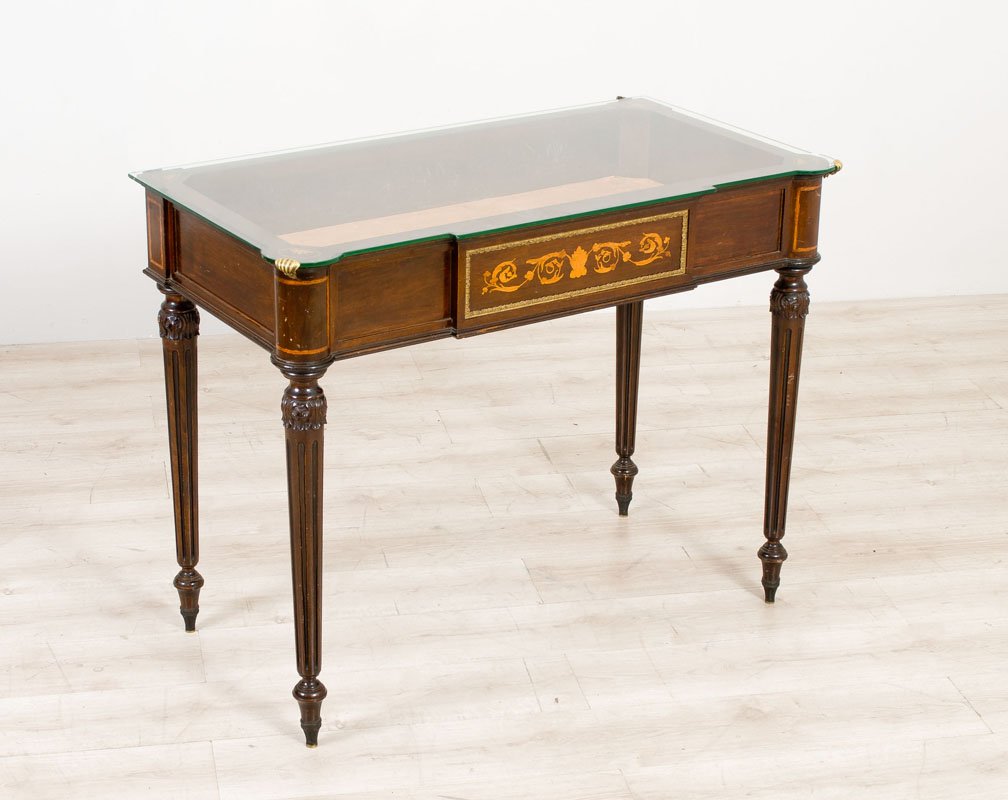 Tavolo a vetrina con intarsi