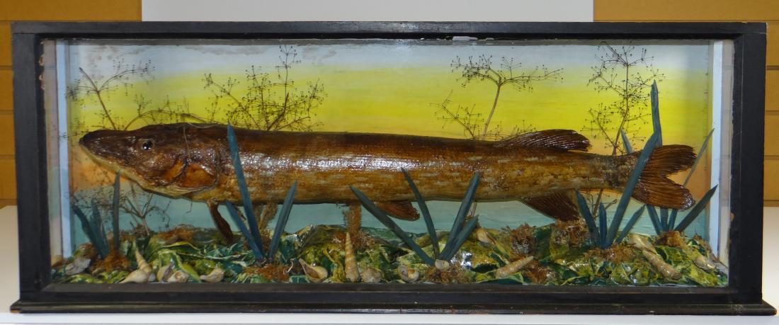 TAXIDERMY RECTANGULAR CASED PIKE within naturalistic