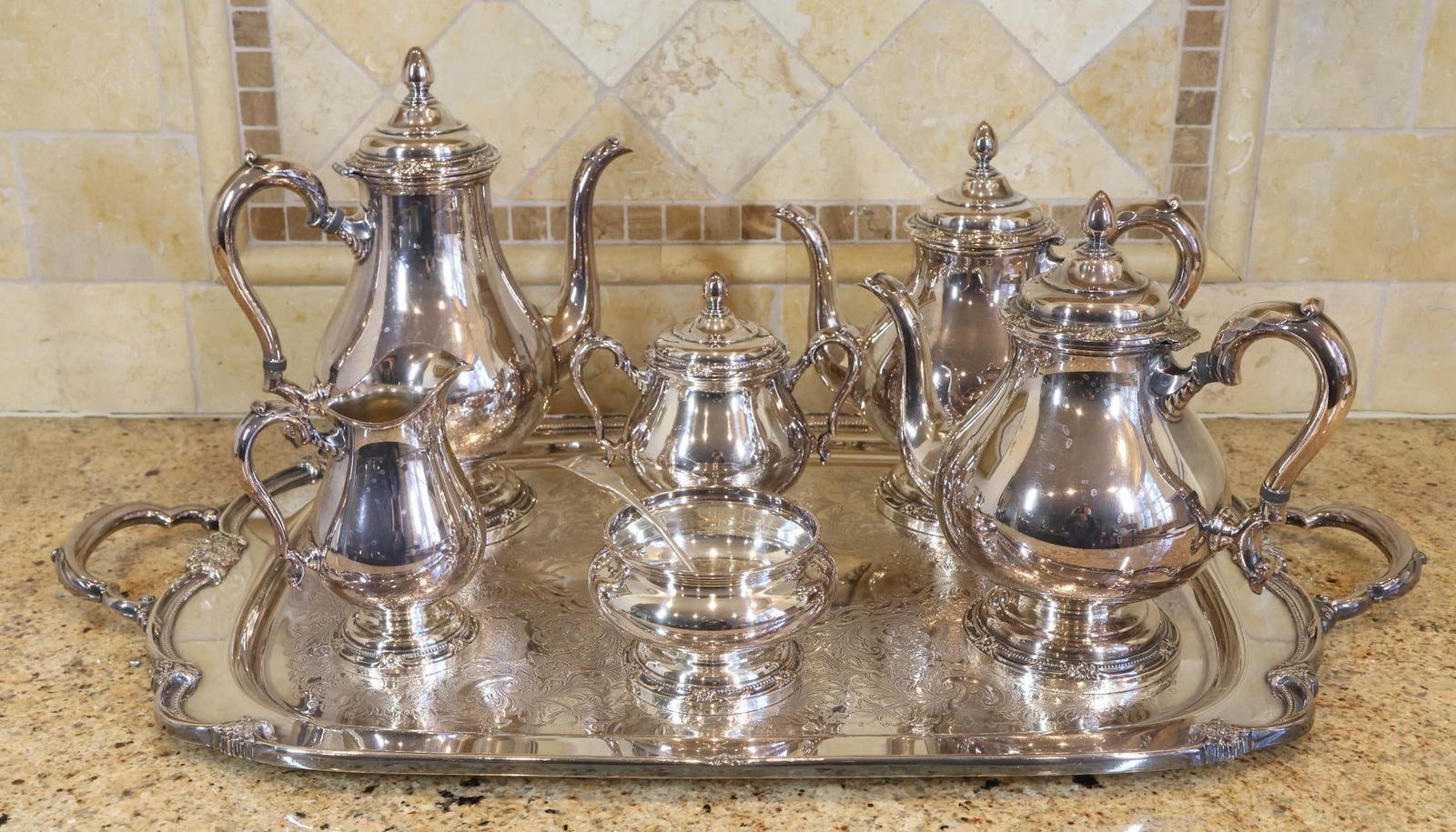 Sold6 pc FRANCIS I STERLING SILVER TEA SERVICEFrancis I by Reed & Barton Sterling Silver Tea Set 5 piece with Monumental King Francis Reed & Barton Silver Plate Tray. Excellent like new condition, no monograms.1948 date mark. Coffee Pot 570A holdSee Sold Price
