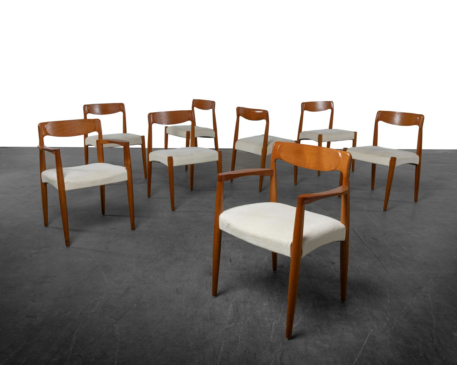 Sold8 NIELS O. MOLLER DANISH TEAK DINING CHAIRS. Wood very good condition.8 NIELS O. MOLLER DANISH TEAK DINING CHAIRS. Wood very good condition. Dimensions: H: 30.5 inches: W: 19.5 inches: D: 17 inches - Seat Height: 17 inches ---See Sold Price