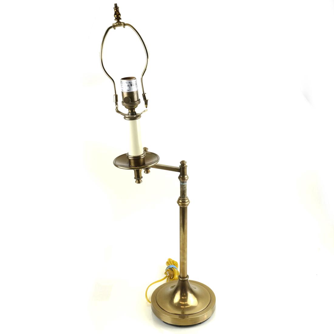 Arts & Crafts period brass table lamp with weighted iron base and having a floral puffy hand paintedArts & Crafts period brass table lamp with weighted iron base and having a floral puffy hand painted shade, not signed. The shade with hairline crack and measures 12" diameter at opening x 14 1/2W x 1