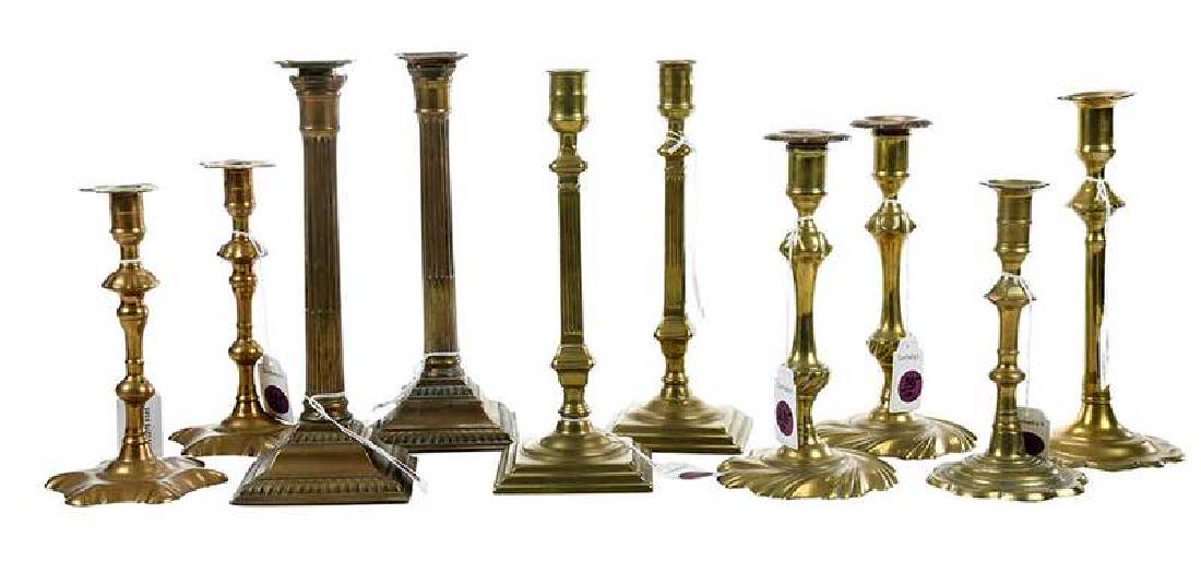 Ten 18th Century Brass Candlesticks, Some Signed