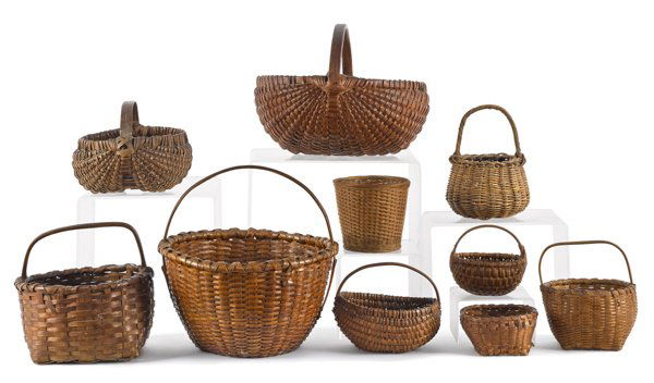 FIVE AMERICAN SPLINT-WOVEN MINIATURE BASKETS WITH HANDLES. Buttocks basket with God's eye, 5"h.Amelia Jeffers, Auctioneers & Appraisers4.6(179)$705 days Left