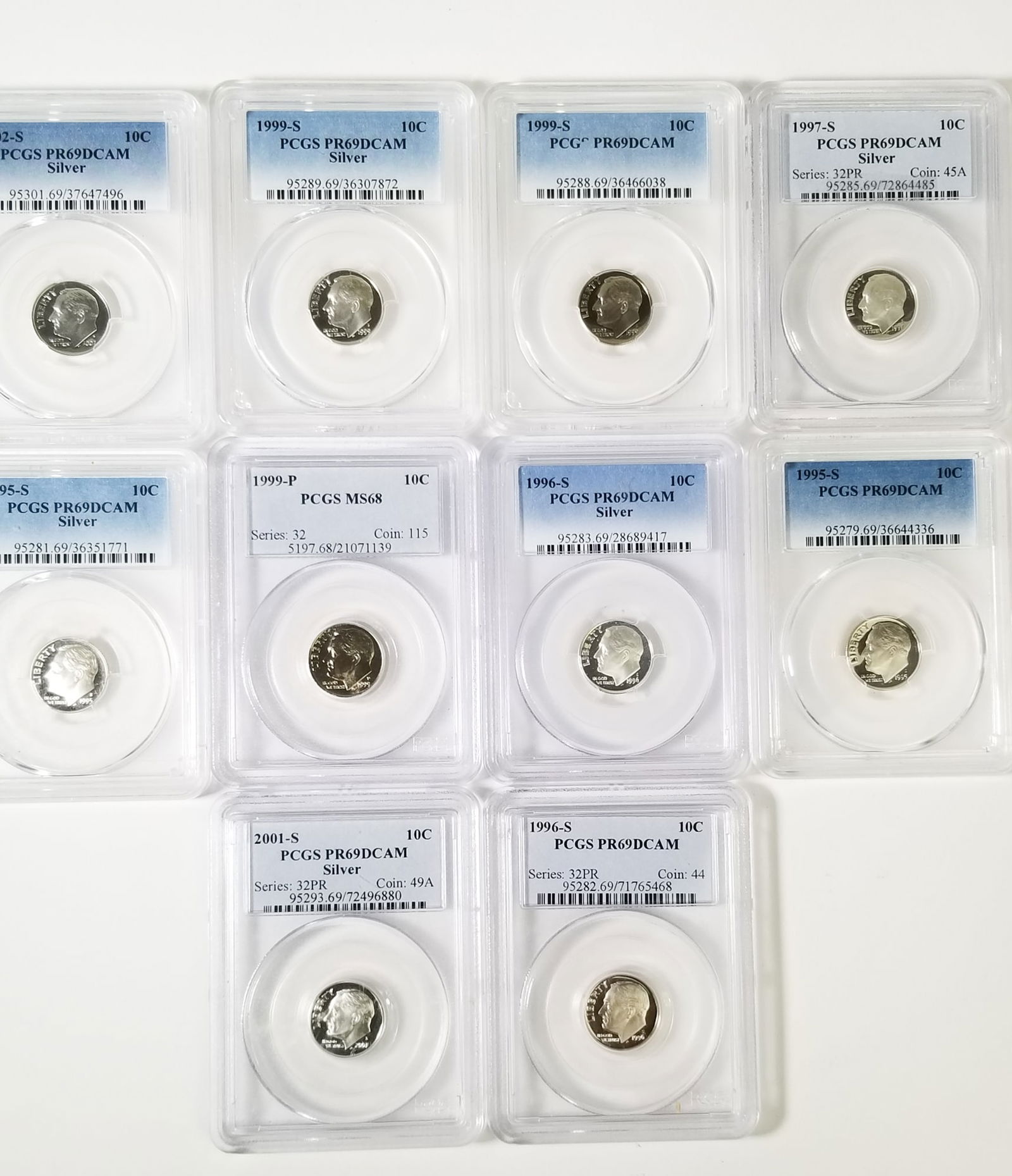 SoldTen Graded Roosevelt Dimes(10) Graded Roosevelt Dimes: 2002S PCGS PR69DCAM - 2003S PCGS PR69DCAM - 2005S PCGS PR69DCAM Silver - 2006S PCGS PR69DCAM - 2009S PCGS PR69DCAM Silver - 2010P PCGS SP67FB Satin Finish - 2010S PCGS PR6See Sold Price