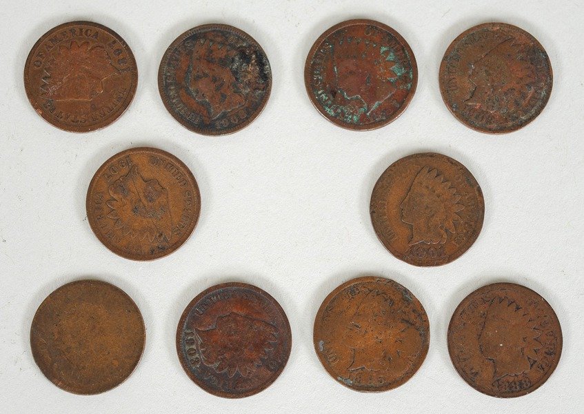 Ten U.S. Indian Head Pennies Dated 1887 - 1907