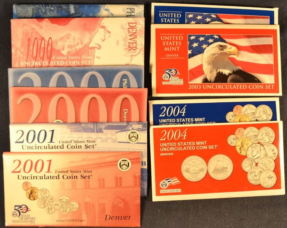 Ten US uncirculated coin sets: 1999 - 2001 PD, 2003 -