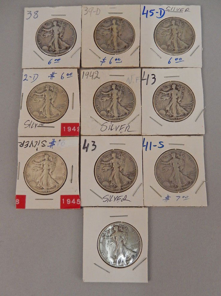 Ten Walking Liberty half dollars, $5.00 face value