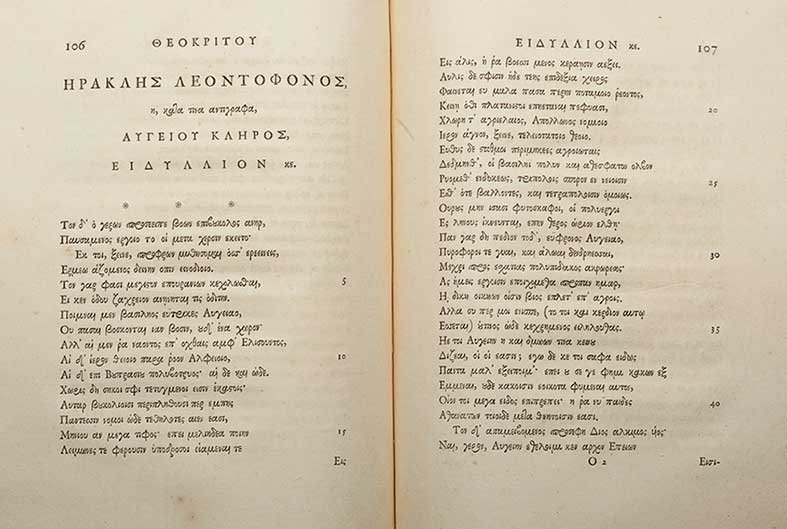 SoldTheocritus. Theocriti, Bionis, et Moschi. Carmina Bucolica., translated by L.C. Valckenaer, text inTheocritus. Theocriti, Bionis, et Moschi. Carmina Bucolica., translated by L.C. Valckenaer, text in Greek and Latin, engraved frontispiece, vignette title, light browning to margiSee Sold Price