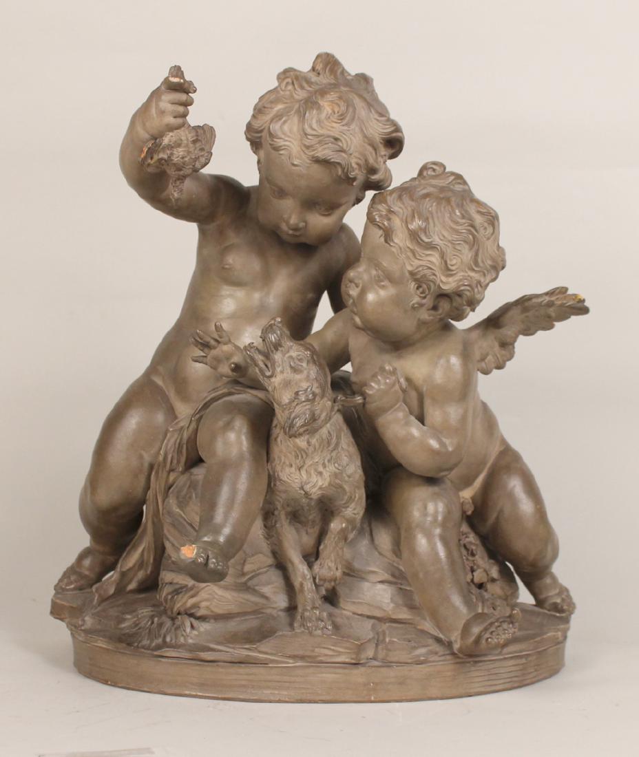 SoldFrench Painted Terracotta Figural GroupFrench Belle Epoque Painted Terracotta Figural Group fourth quarter 19th century, modeled as a cherub and a putto teasing a lunging hunting dog with a dead game bird. h. 18-1/4", w. 14", d. 8-1/4"See Sold Price