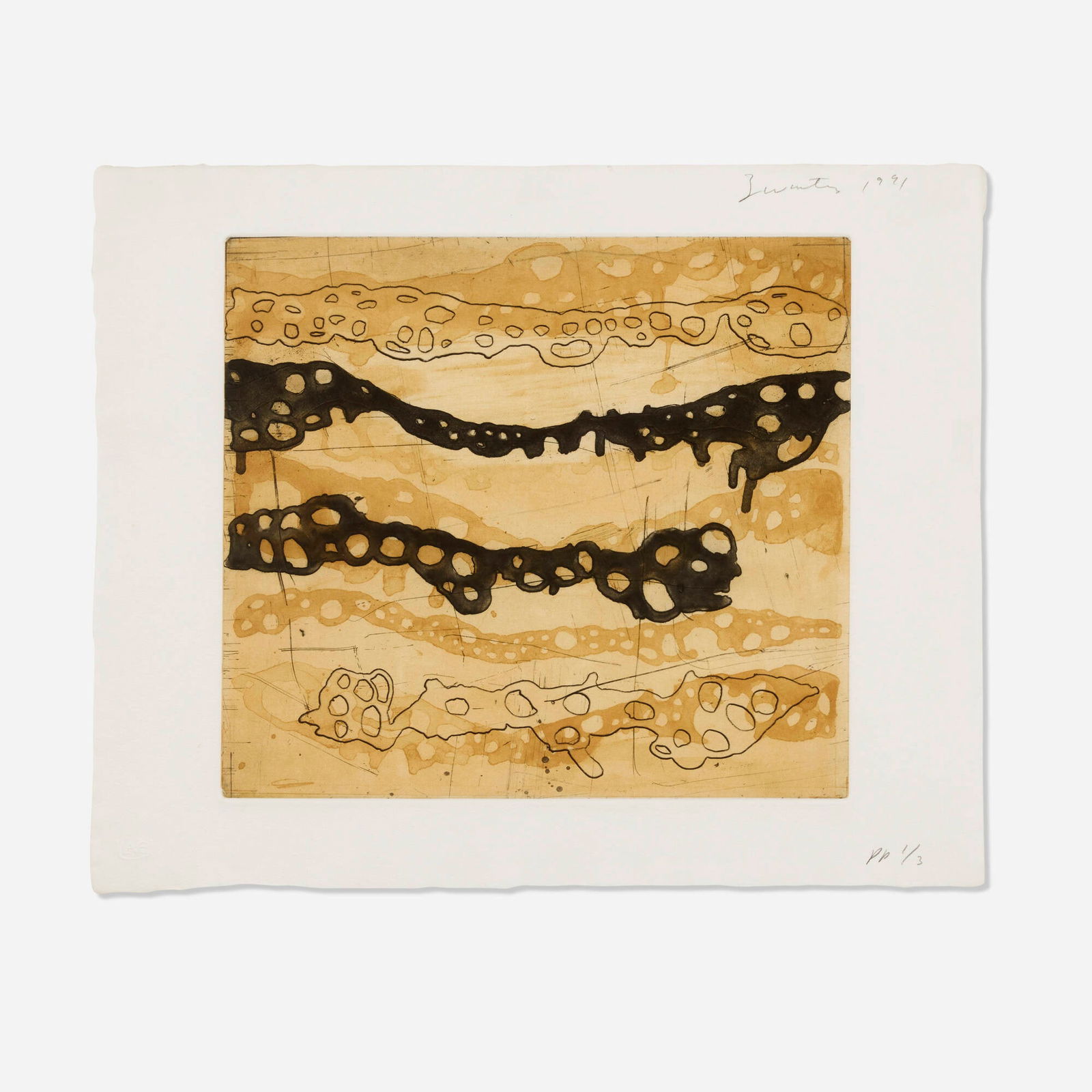 SoldTerry Winters, intaglio, 1988Terry Winters, intaglio, 1988, Terry Winters (American, b. 1949), "Station", Intaglio with spit bite aquatint on Sekishu Torinoko Gampi paper laid down on J. Whatman 1952 paper, pencil signed, dated aSee Sold Price